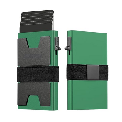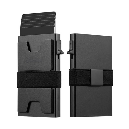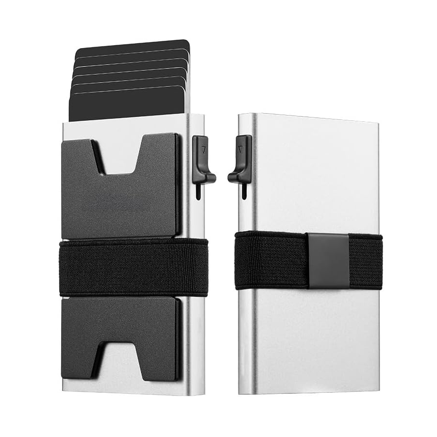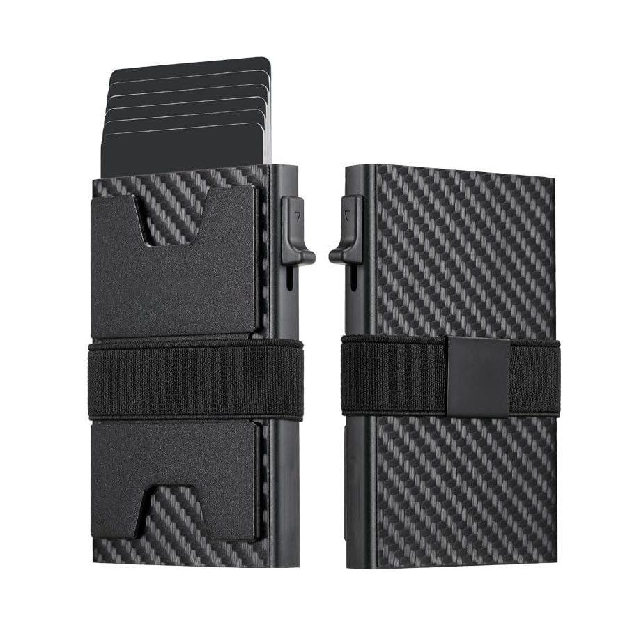 Introducing the ultimate slim wallet for the modern man, a sleek, RFID-blocking cardholder with a hard protective shell, quick-access button, and compact design that fits effortlessly into any pocket, offering style, security, and convenience in one.