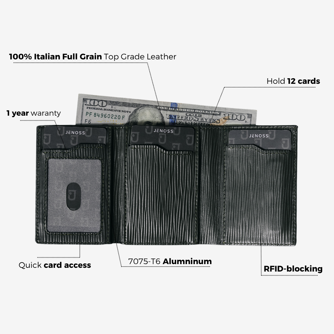 - Type: Trifold Wallet with Popup Card Holder (up to 6 cards) (side slider)